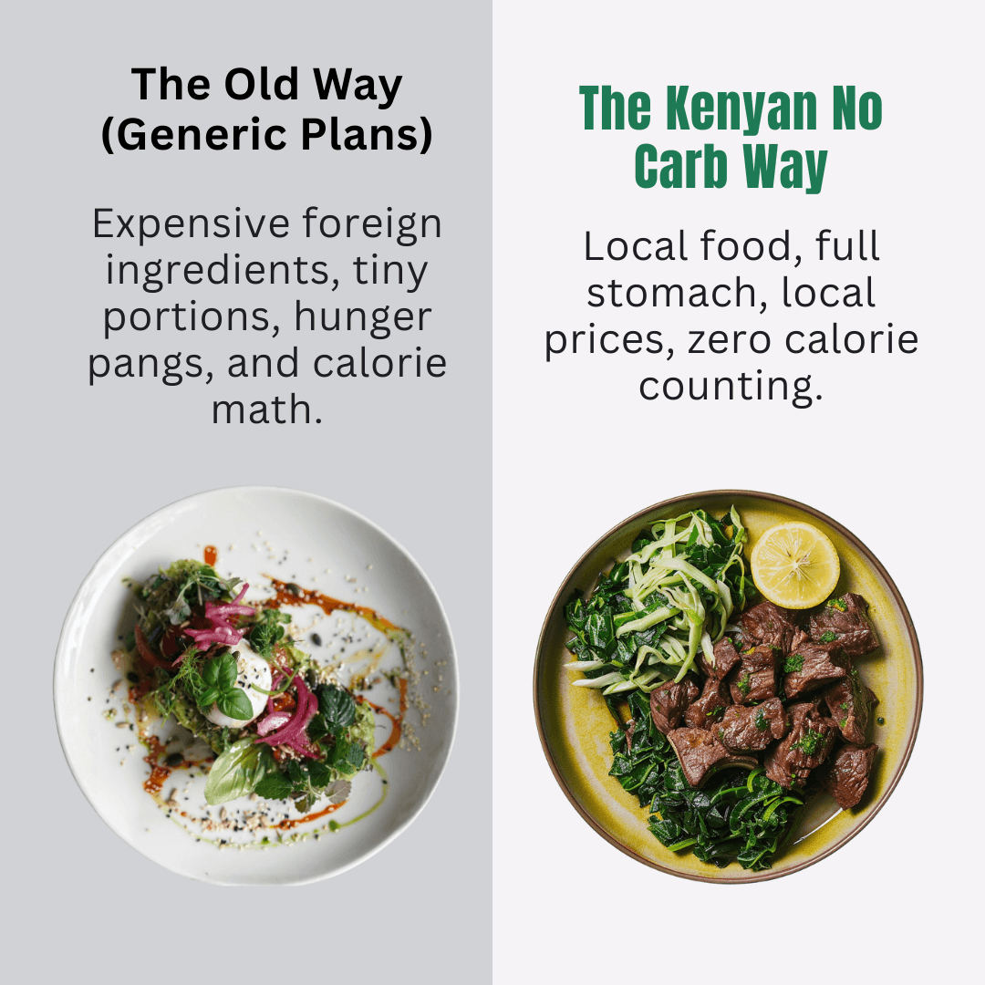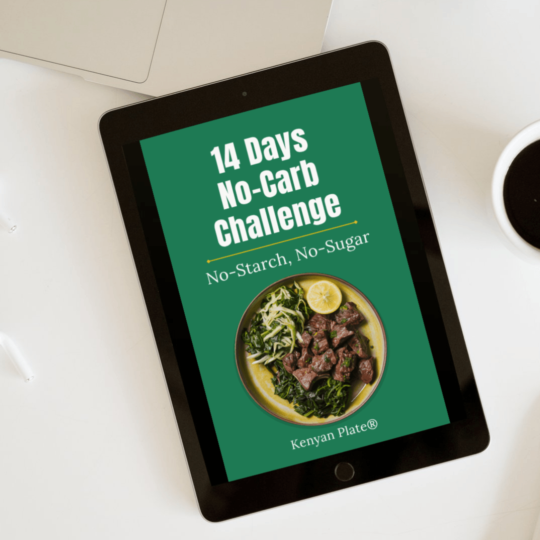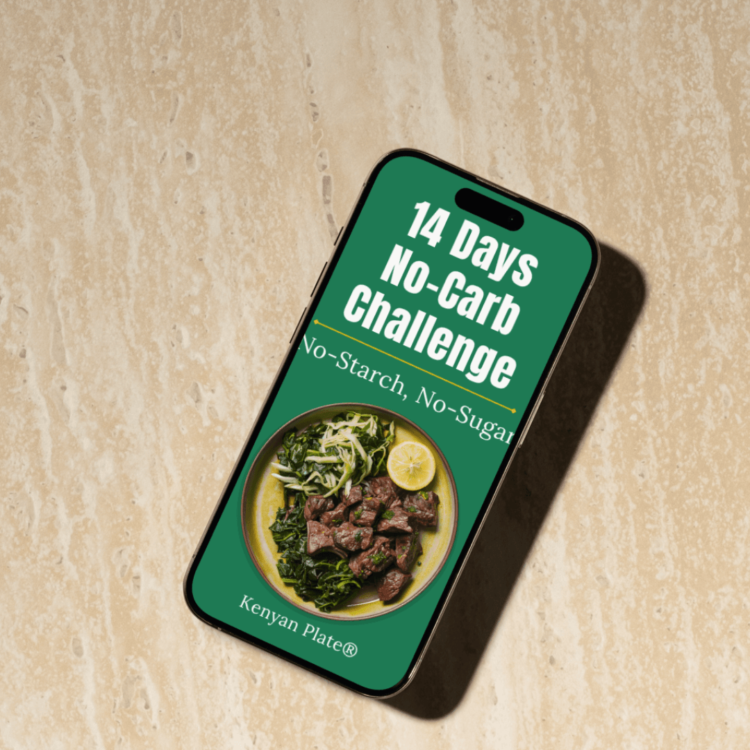 For 14 days, we’re removing starches and added sugar so your body can reset. In Kenya, that means skipping ugali, chapati, rice (including pilau), matoke, potatoes, githeri, bread, pasta, cereal, mandazi/cakes, soda and juices. You’ll build meals from protein, low-carb vegetables, and healthy fats you can buy in any supermarket or open-air market.